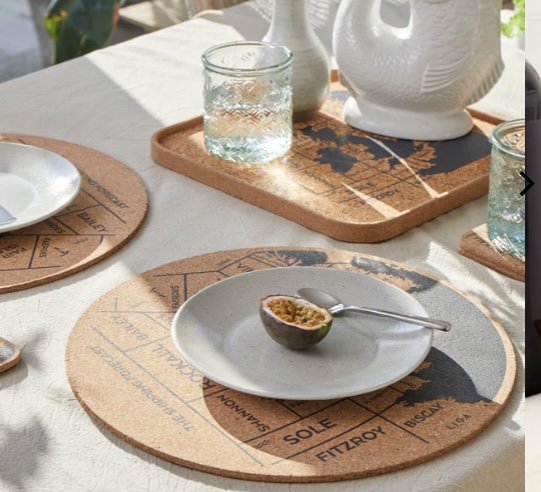 The Shipping Forecast has guided mariners since 1925 but also been relaxing listening to many people during its daily broadcast on BBC Radio Four. To commemorate this milestone, a range of placemats, coasters, and trays have been produced using natural cork. These are sure to be a talking point with dinner guests.