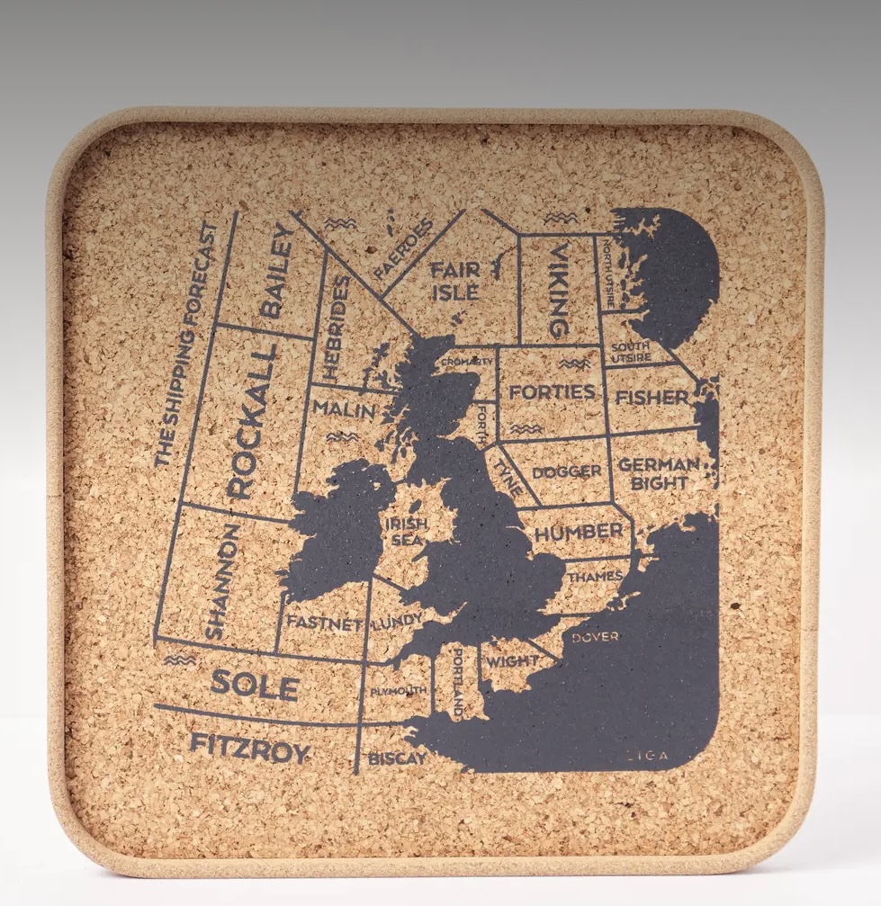 The Shipping Forecast has guided mariners since 1925 but also been relaxing listening to many people during its daily broadcast on BBC Radio Four. To commemorate this milestone, a range of placemats, coasters, and trays have been produced using natural cork. This tray is the ideal size for serving drinks to your family or friends.